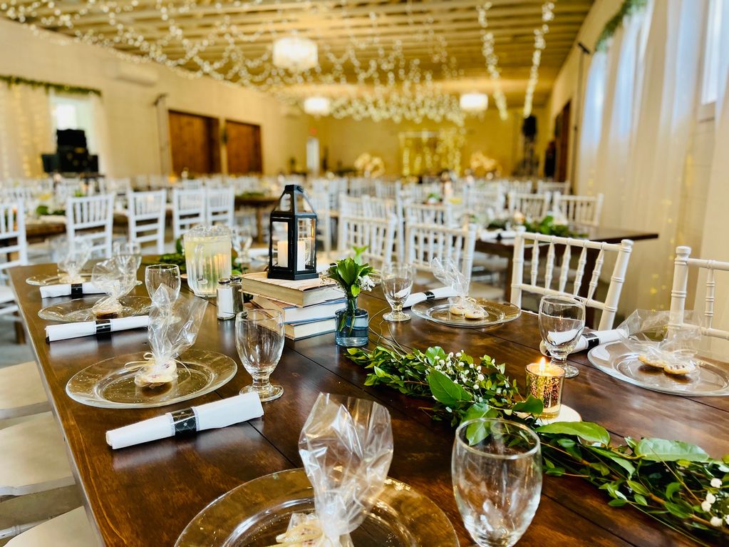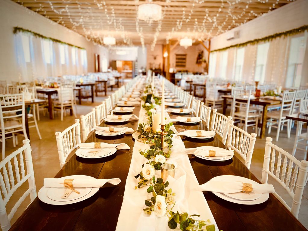 Twenty 8’ custom built farm tables, 40 round tables, round white linens, white chiavari chairs for the reception room/garden area and white pews for the ceremony room provided. A small service cleaning fee for each linen.