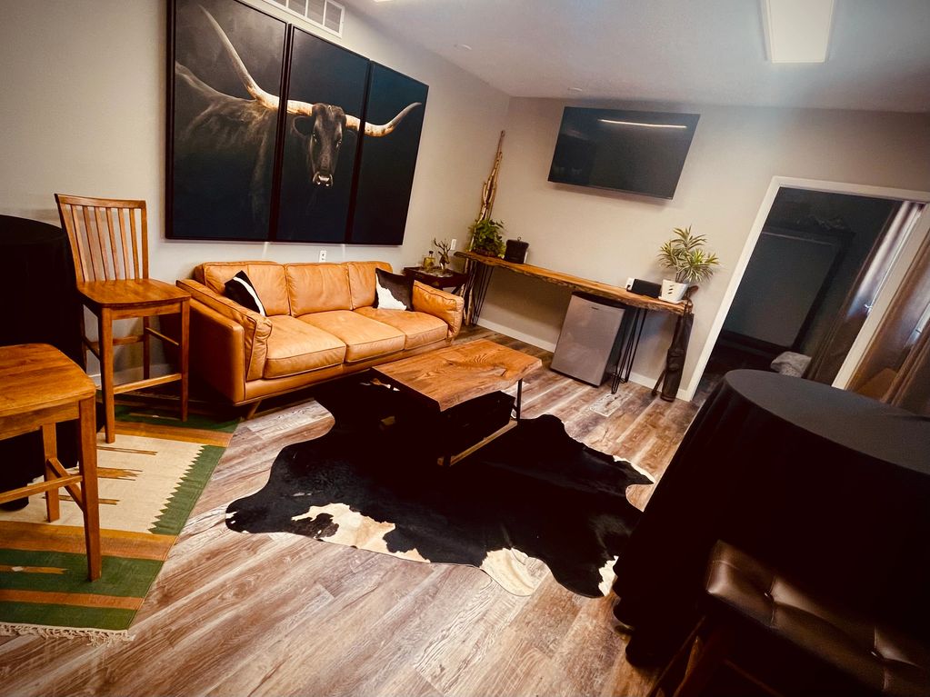The groom's room offers space to get ready and relax with a separate dressing room, bar area and large screen t.v.